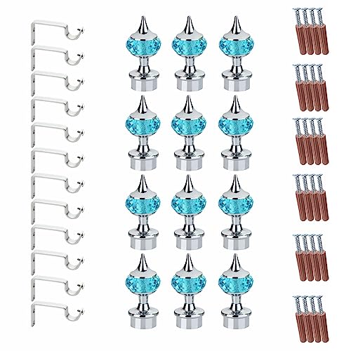 GLOXY Single Diamond Aluminum Curtain Holder with Brackets Full Set with Support Fittings Designer 1 Inch Rod Pocket Finials for Door & Window(Silver Mix Sky Blue,Set of 6)