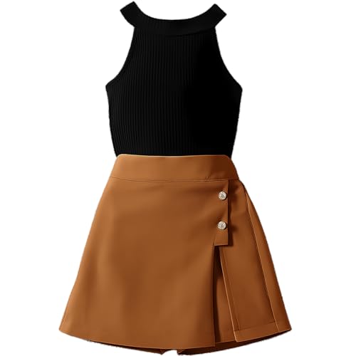 RIYANSHI Girls’ Two-Piece Outfit Set with Black Ribbed Tank Top and Cream Skirt