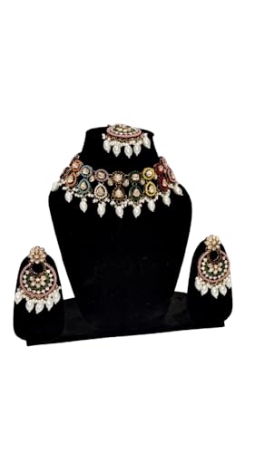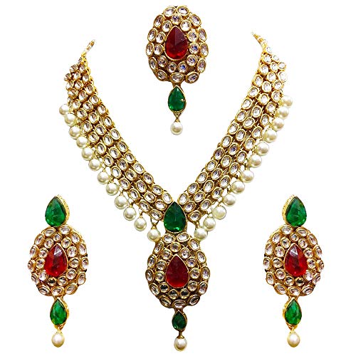 J.D. Creation Traditional Indian Jewellery Set with Necklace, Earrings and Maang Tikka, Pearl and Multi-Colour Stone Design