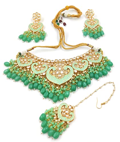 Bella Store Handmade Light Green C-Green Kundan Meenakari Chokar Necklace With Earrings And Mangtika For Women And Girls