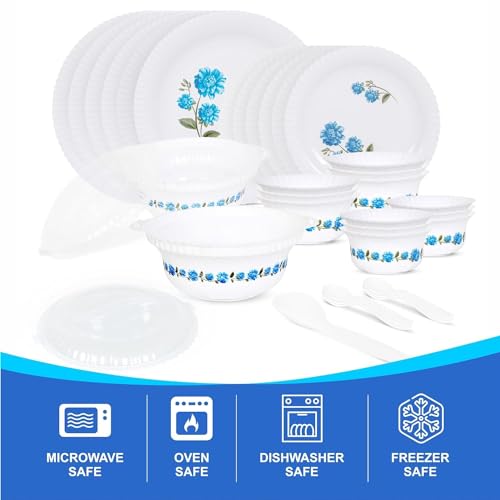 Upgrade your dining experience with this elegant 36-Piece Round Plastic Dinnerware Set, designed for both daily use and special occasions. Made from high-quality, food-grade plastic, this dinner set is lightweight, durable, and unbreakable — making it ideal for families, homes, and gifting purposes.The set includes 6 large plates, 6 small plates, 12 bowls, 6 table spoons, 2 serving spoons, and 2 serving bowls with lids — everything you need for a complete dining setup. Its beautiful blue floral print adds a touch of style and sophistication to your table.Perfect for home use, outdoor picnics, parties, and festive gatherings, this dinner set combines practicality with modern design. Easy to wash, stack, and store, it ensures convenience and hygiene in every meal.A smart and sustainable choice for your kitchen, this unbreakable dinnerware set is the perfect blend of beauty, functionality, and durability.