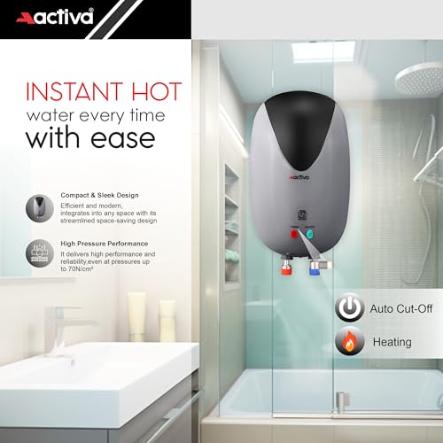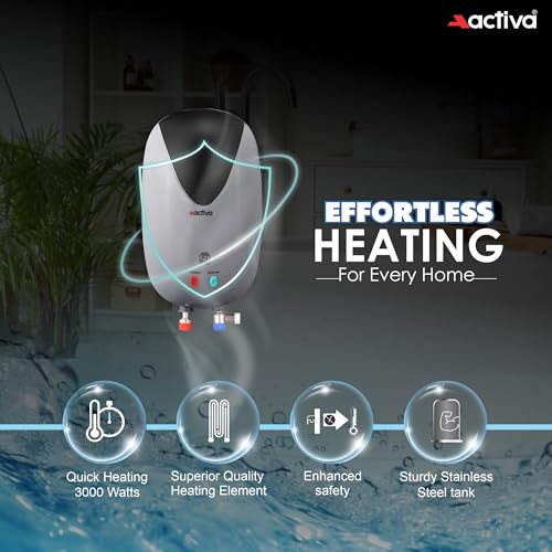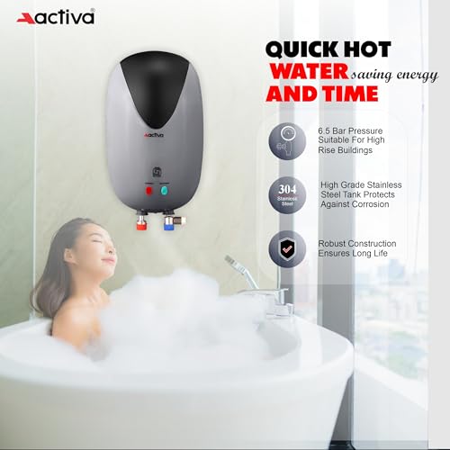 Activa 3 Liters Quick Water Heater Geyser, 3 KVA ISI Copper Element, 0.7mm Anti Rust Coated 304L Pure Stainless Steel Tank, Auto Cut-Off, ABS Body, BEE 5 Start Rated, 5 Year Warranty – Grey & Black
