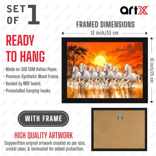 ArtX Set of 1 Small Seven Horses Vastu Painting: Embrace the power of artistry with our exquisite selection of paper / canvas paintings for wall decoration. Discover a stunning array of abstract paintings for living room, including wall paintings and canvas paintings for wall decoration, each meticulously crafted to breathe life into your living room. Aesthetic Elegance: Immerse yourself in the world of aesthetics with our carefully chosen aesthetic room decor items. From wall paintings for the bedroom to living room wall decorative items, Our Wall decoration items for living room collection is designed to create an environment that soothes the senses and pleases the eye. Abstract Marvels: Delve into the world of abstract artistry with our abstract paintings for the living room. These captivating pieces invite intrigue and conversation, infusing your space with a sense of creativity and wonder. Scenic Beauty: Bring the beauty of the outdoors inside with our scenery for wall with frames. Whether you prefer serene landscapes or vibrant cityscapes, our collection of wall scenery for living room offers a diverse range of options to satisfy your artistic preferences. Big Impact: Make a bold statement in your living room with wall painting for living room in generous sizes. These larger-than-life artworks become the centerpiece of your decor, adding drama and personality to your space. Harmony in Home Decor: Our wall paintings for home decoration seamlessly blend with your interior design, creating a harmonious and inviting atmosphere. Explore living room wall decorative items that enhance the overall visual appeal of your space. Quality Craftsmanship: We take pride in offering high-quality wall decoration items for your living room. Our canvas paintings for wall decoration and wall painting for bedroom are crafted with meticulous attention to detail and an emphasis on longevity.
