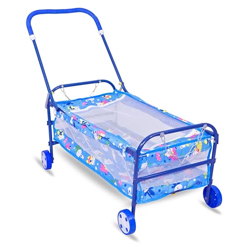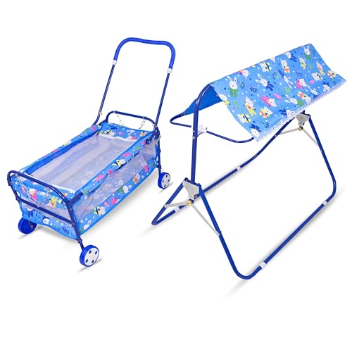 This cradle for newborn babies is a delightful blend of functionality and charm. Its sturdy white metal frame on wheels ensures easy mobility, while the vibrant blue fabric adorned with playful bunnies and floral motifs creates a cheerful and whimsical ambiance. The cradle’s mesh sides provide excellent ventilation, and the padded mattress ensures your little one’s comfort. With its compact size and lightweight design, this cradle is perfect for both indoor and outdoor use, allowing you to keep your precious bundle of joy close by. Crafted with care, this cradle offers a safe and cosy haven for your baby’s peaceful slumbers.