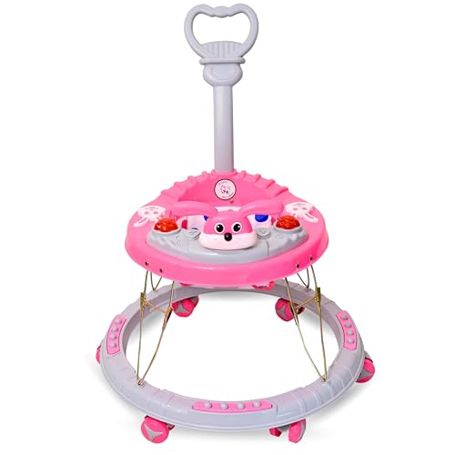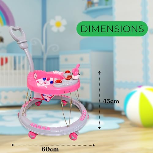 Introduce your little one to the joy of movement with this delightful baby walker! Featuring a charming and design with an adorable bunny-themed interactive tray, this walker combines entertainment with developmental benefits. The musical and light features keep your baby engaged while learning to walk, whilst the comfortable seat provides proper support. The sturdy push handle allows parents to guide their little ones, making those first steps more secure. Equipped with six smooth-rolling wheels for enhanced stability and manoeuvrability, this walker ensures safe exploration. The interactive play tray includes engaging buttons and activities to stimulate your baby’s sensory development. Its height-adjustable design grows with your child, making it a lasting companion through various stages of early mobility. The walker’s wide, circular base provides excellent stability, while the cushioned seat ensures comfort during playtime. Perfect for babies learning to take their first steps, this walker offers both entertainment and developmental support in one cheerful package.