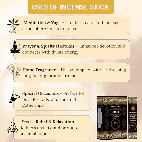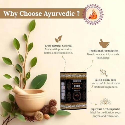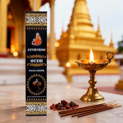 Immerse yourself in the rich, woody, and calming aroma of Ayurvedic Oudh Masala Incense Sticks. Known for its deep and luxurious fragrance, Oudh (Agarwood) has been used for centuries in spiritual rituals, meditation, and healing practices. These incense sticks are hand-rolled with natural ingredients, offering purity and authenticity in every stick. Perfect for puja, meditation, yoga, and daily prayers, Oudh incense creates a divine and soothing environment that helps calm the mind, reduce stress, and enhance spiritual focus. The aroma is long-lasting, leaving your home, office, or meditation space smelling pleasant and inviting even after the stick has burned out. This value pack includes 12 boxes with 15 sticks each (total 180 sticks), ensuring a long-lasting supply for daily rituals. Each incense stick measures 23.5 cm, allowing for slow, even burning and an enriching aromatic experience. Beautifully packed, it also makes an excellent gifting option for loved ones on special occasions like Diwali, Rakhi, weddings, and housewarmings. Bring home Ayurvedic Oudh Masala Incense Sticks – the perfect blend of tradition, luxury, and spirituality to elevate your space with peace, purity, and fragrance.