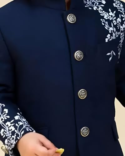 Baby Boy Sherwani Set for Wedding & Festivals | Navy Blue Art Silk Embroidered Jacket with White Cotton Pant | Traditional Dress for Boys 1-8 Years