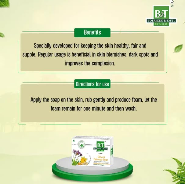 B&T Glow & Fairness soap has the goodness of Aloe vera, Calendula, Pulsatilla, Berberis Aquifolium, Curcuma and Sandalwood and helps to protect the skin while making it soft. It improves the skin tone, increases the glow and protects the skin from infections.