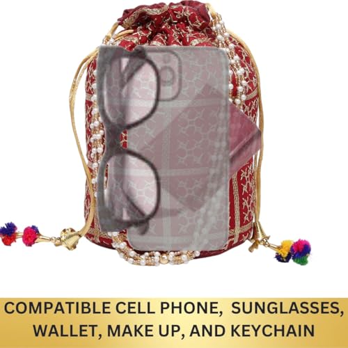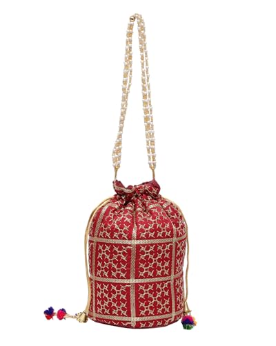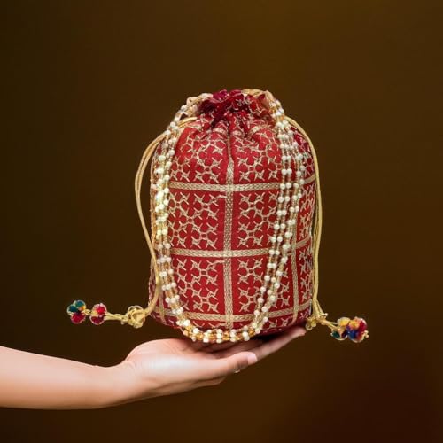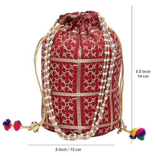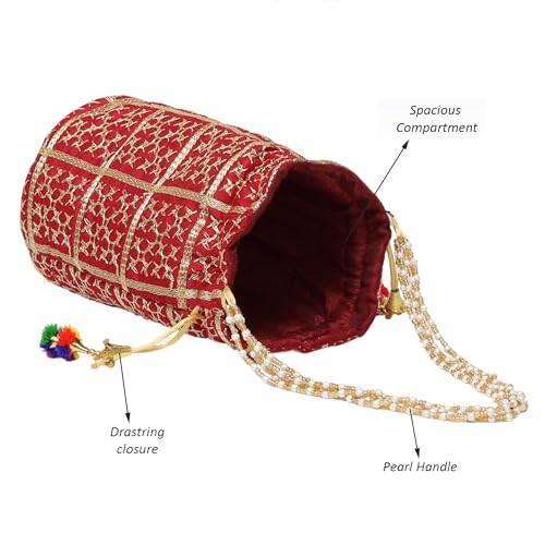 Embellished Silk Bridal Style Hand Embroidery Potli For Womens With Pearl Accents | Ideal For Parties, Weddings And Festive Season (Maroon)