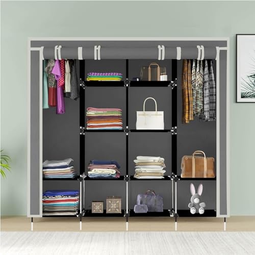 GTC 12-Shelf Collapsible Wardrobe – Portable Foldable Grey Almirah with Plastic Frame, Fancy Layer Rack for Clothes Organizer (Model 88370)