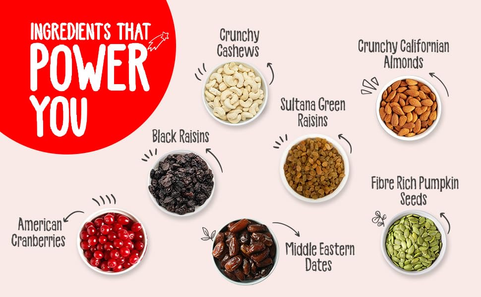 Almonds, cashews nuts, green raisins, black raisins, We almost ran out of breath. Take things to the next level with this superfood mix!