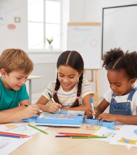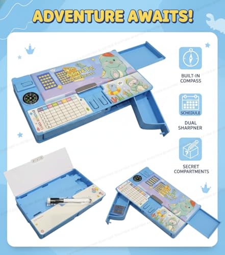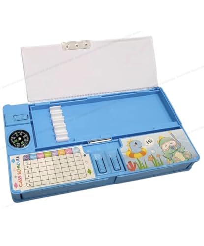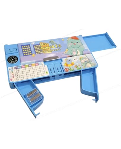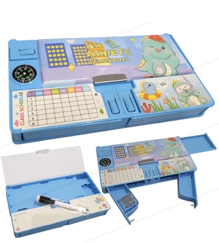 Kids Dinosaur Game Pencil Box, Blue Plastic Pencil Box with Athlete Theme,Toy with Built-in Pencil Sharpener Box. (Blue-TIMETABLE)