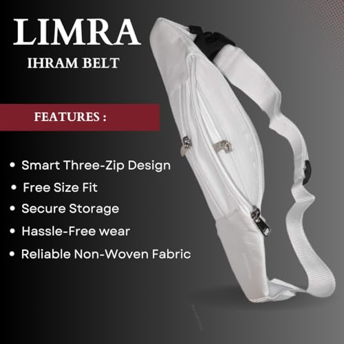 LIMRA Ihram Belt, featuring three zips and a free-size fit, ensures a secure and comfortable pilgrimage. Easily adjust for a hassle-free experience. Trust LIMRA for reliable and durable pilgrimage essentials.
