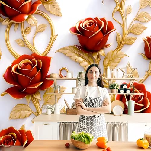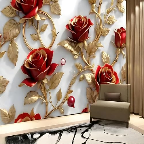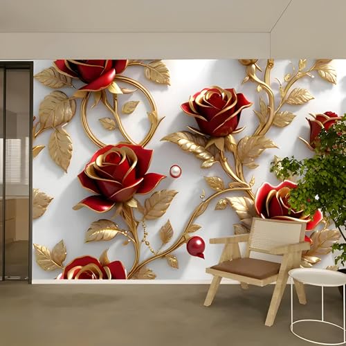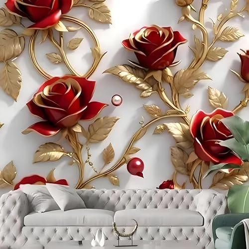 Elegant Red Rose & Gold Floral Design: Stunning 3D roses with golden leaves, ideal for creating a luxurious and romantic wall backdrop.