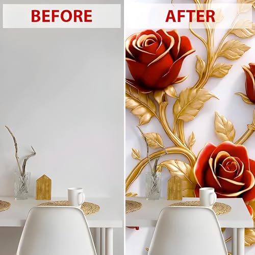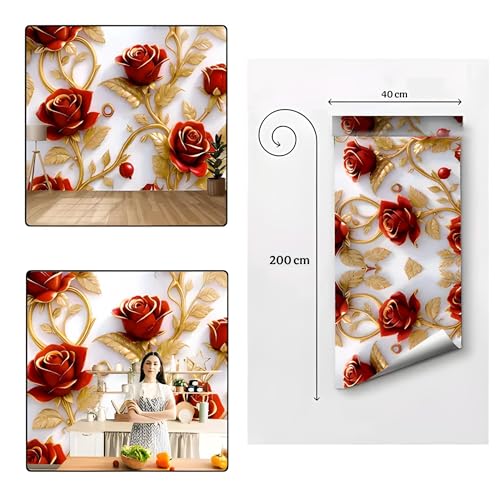 Enhance your interiors with the MagJet 3D Red Rose and Gold Floral Wallpaper Mural, designed to bring a touch of romance, luxury, and elegance to your walls. Featuring deep red roses with golden leaves in a 3D embossed effect, this wallpaper creates a striking focal point in any room. The 40×200cm removable wall covering is made from durable, waterproof, and fade-resistant vinyl, ensuring long-lasting beauty and easy maintenance. With its peel-and-stick self adhesive design, installation is quick, mess-free, and renter-friendly—no glue or tools required. Perfect for living rooms, bedrooms, dining areas, pooja rooms, offices, or accent feature walls, this wallpaper adds a luxurious and stylish upgrade to your home decor.