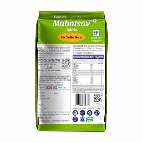 Experience authentic taste and nutrition with Mahotsav PR Sella Rice 26 Kg, a premium-quality parboiled rice that brings together the goodness of nature and science. Carefully processed using the parboiling method, this rice preserves essential nutrients and delivers perfectly cooked grains that are long, fluffy, and non-sticky—ideal for a variety of Indian and continental dishes. This rice is fortified with essential vitamins and minerals including Iron, Zinc, Folic Acid, Vitamin A, B1, B2, B3, and B12, making it not only delicious but also nutritionally rich. With high protein content (7.1g per 100g) and zero added sugar, it supports muscle health, energy levels, and immunity while helping maintain a balanced diet. The addition of key minerals like Phosphorus, Magnesium, Potassium, and Selenium helps support bone health, nerve function, and antioxidant activity. Low in fat and sodium, Mahotsav PR Sella Rice is a wholesome choice for families aiming for a heart-healthy diet. Whether you’re cooking a festive biryani, a daily tiffin, or a lavish dinner spread, Mahotsav PR Sella Rice turns everyday meals into flavorful celebrations. Packed in a durable 26 kg bag, this rice offers great value and consistent quality—every single time.
