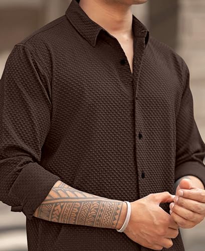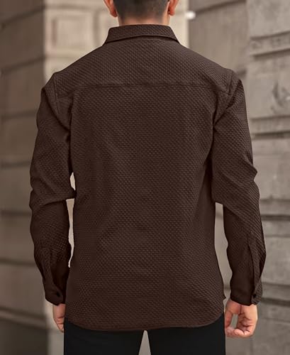 Men’s Casual Button Down Shirts Long Sleeve Cotton Bland Shirt Fashion Textured Beach Summer Shirt (IN, Alpha, M, Regular, BROWN)