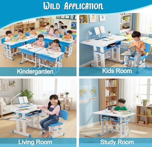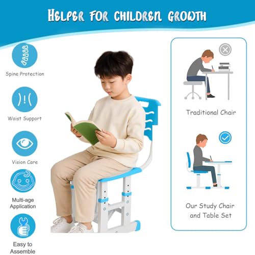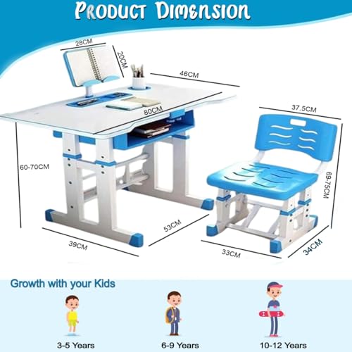 NUCARTURE Adjustable Kids Study Table with Chair Set 3 to12 Years Drawing Learning Reading Children Study Desk Table with Chair Kids Studying Table with Book Pen Holder (Blue)