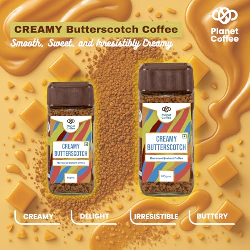 Planet Coffee® | CREAMY Butterscotch Coffee | 50 Gms Jar | Pure Arabica | Freeze-Dried Instant Coffee | No Added Sugar | Makes 25 Cups | Medium Roast | Flavoured Coffee
