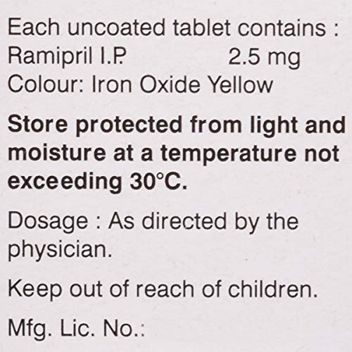 Composition: Each uncoated tablet contains: Ramipril I.P 2.5 mg. Colour: Iron Oxide Yellow. Dosage: As directed by the physician.