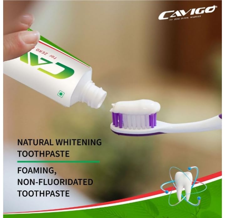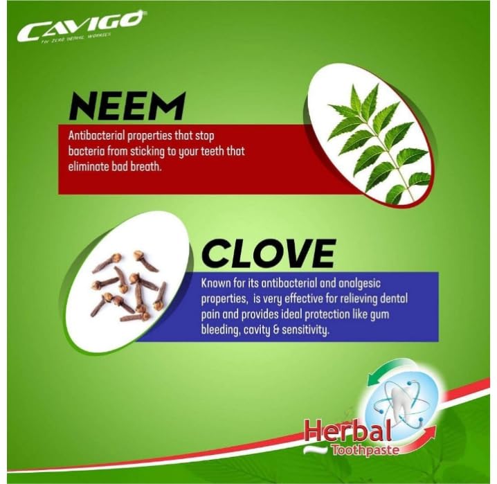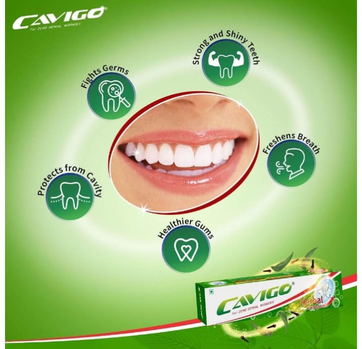 Cavigo Toothpaste is enriched with Laung (Clove) and extracts of Neem which gives you extra long-lasting freshness throughout the day and several other benefits to maintain a healthier mouth. This toothpaste is accepted as anti-cavity, teeth whitening, antiplaque and tartar protection solution. It also provides gentle whitening with a natural enzyme that also takes care of your tooth enamel and gums.