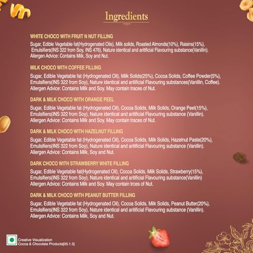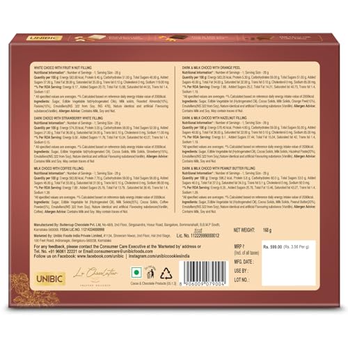 “Indulge in the luxurious experience of Unibic’s Le Chocolatier Assorted Chocolate Gift Pack, a newly launched collection designed to satisfy the most refined chocolate cravings. This exquisite gift box is a celebration of rich flavors and indulgent textures, perfect for any special occasion.Unibic’s La Chocolatier brings together a delightful assortment of unique chocolate creations, each crafted with dedication and artistry. Discover the creamy richness of White Chocolate with Fruit N Nut, the tantalizing contrast of Dark Chocolate with Strawberry White Filling, and the smooth elegance of Milk Chocolate infused with Coffee. For those who crave a hint of citrus, the Dark & Milk Chocolate with Orange Peel offers a zesty twist, while the Dark & Milk Chocolate with Hazelnut Filling provides a nutty depth. And for a touch of nostalgia, the Dark & Milk Chocolate with Peanut Butter Filling delivers a comforting, velvety experience.Each chocolate is not just a treat but an experience, with luscious center fillings that elevate the taste to a new level of indulgence. Made with the finest ingredients, every bite is a testament to quality and craftsmanship.Whether you’re celebrating a special moment or simply treating yourself, Unibic’s La Chocolatier Assorted Chocolate Gift Pack is the perfect choice. It’s more than just a box of chocolates; it’s a thoughtful, elegant gift that shows you care. Elevate your gifting game with Unibic’s La Chocolatier—More than just Chocolate, it’s the perfect gift.”