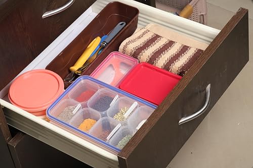 UNICA Spice Box With 8 Pots & 4 Tea Spoons, Plastic Spice Organizer With Air Resistant Lid & Non-Slip Base, Multipurpose Tray For Mukhwas, Spices, Herbs, Dishwasher-Safe,Transparent