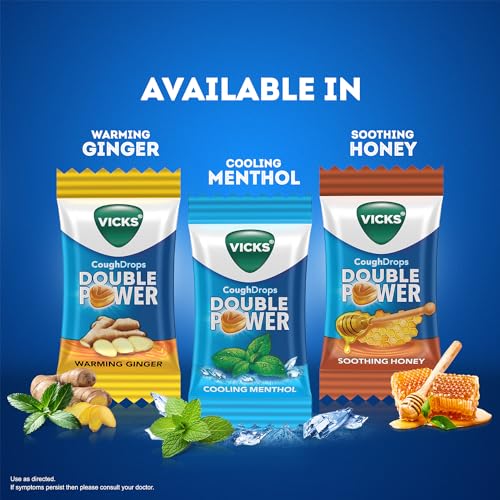 Your trusted Khich Khich relief partner, VICKS KI GOLI is now VICKS COUGH DROPS DOUBLE POWER. ALL NEW VICKS COUGH DROPS DOUBLE POWER are infused with Eucalyptus oil, Camphor and Menthol. This double power drop provides FAST & LASTING RELIEF FROM Sore throat. These NEW & IMPROVED drops gently melt in your mouth to form a soothing coating that calms your throat. Feel the cooling sensation as it eases pain and irritation, giving you much-needed comfort to go about your day with ease and confidence. Vicks Cough Drops Double Power come in 3 FLAVOURS with proven ingredient – WARMING GINGER, COOLING MENTHOL AND SOOTHING HONEY. Grab a bag now to get long lasting relief from a sore throat.