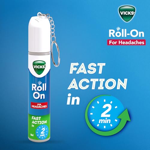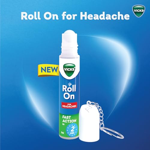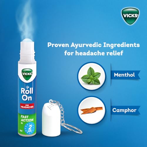 FAST ACTION IN 2 MINUTES: NEW Vicks Roll-On has a fast vapor action formula that starts working in only 2 minutes. NON-GREASY FORMULA WITH PROVEN AYURVEDIC INGREDIENTS: NEW Vicks Roll-On has menthol and camphor that are known to be proven ayurvedic ingredients for headache relief.ROLLER BALL TECHNOLOGY: NEW Vicks Roll-On comes with a roller ball technology for effective application that can last up to 200 uses.EASY TO CARRY: NEW Vicks Roll-On comes with a keychain so you can carry and use it for headache relief anytime, anywhere.