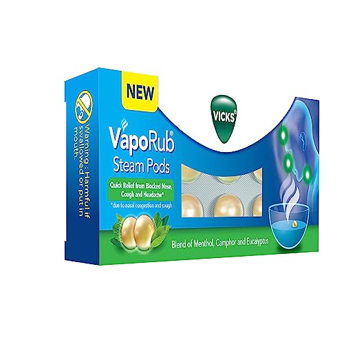 Vicks VapoRub SteamPods gives quick relief from blocked nose, sinus congestion, headache, and cough due to cold. How to use: For steam inhalation in adults and children 6 years and above: 1.Put 1 Steam Pod into a bowl of hot (not boiling) water. 2.Cover head with towel. 3.Gently inhale for 10-15 minutes. 4.Repeat up to 3 times per day.