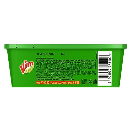 Vim is the No.1 dishwashing brand in India. 7.4 out of 10 urban Indian households are regular Vim dishwash bar users. With the power of 100 lemons, Vim dishwash bar easily removes the toughest of stains. It does wonders in cleaning even in small quantities and provides the fastest degreasing of stains, reducing the overall time and efforts required to clean the utensils. It is the only dishwash bar which comes with a sturdy waterproof tub that is specially designed to minimise wastage and ensures that the bar sogs less and lasts longer than other bars without a tub. The pack contains a free scrubber inside. Vim dishwash bar provides a pleasant cleaning experience, as it leaves a refreshing lemon fragrance on the utensils which lasts long after rinsing. It is extremely gentle on hands. It can safely be used for cleaning all types of utensils like stainless steel, ceramic, non- stick ware, glass etc. Along with tub packs, Vim bar is also available in single and multi-packs. Vim dishwash bar comes in an Anti-Smell variant too, which is also available in the market. Vim’s Anti Smell range contains pudina burst speckles that gives great in-wash freshness, doubled with the power of lemons.