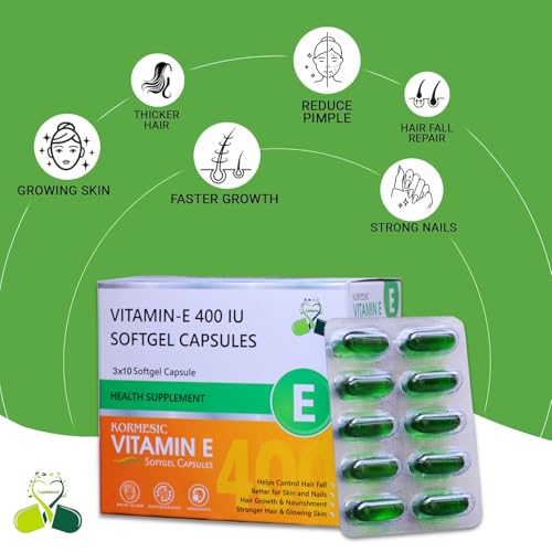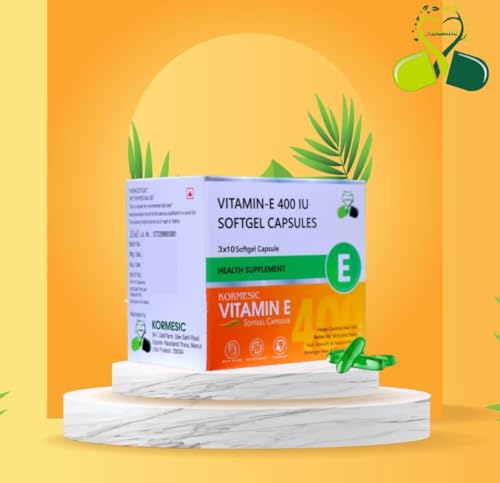 KORMESIC Vitamin E Capsules are offered in softgel format, containing Vitamin E and designed for both oral and topical use. The capsules can be swallowed whole or the softgel can be pierced to release the Vitamin E oil inside. This oil is commonly added to personal care products such as moisturizers, facial masks, or hair oils. Users may choose to include it in their skincare or haircare routines as per their requirements. The oil has a thick consistency and is suitable for blending with various carrier oils or creams. Vitamin E is generally recognized for its antioxidant content, and is often used in personal care for skin hydration and hair conditioning purposes. The product is offered in compact packaging that can be stored easily or carried during travel.