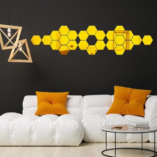 Wall1ders 20 Hexagon with10 Butterflies Golden (Hexagon Size 10 x 12 cm) Hexagonal Mirror Wall Sticker for Hall Room, Living Room, Bed Room, Kitchen, Home & Offices.