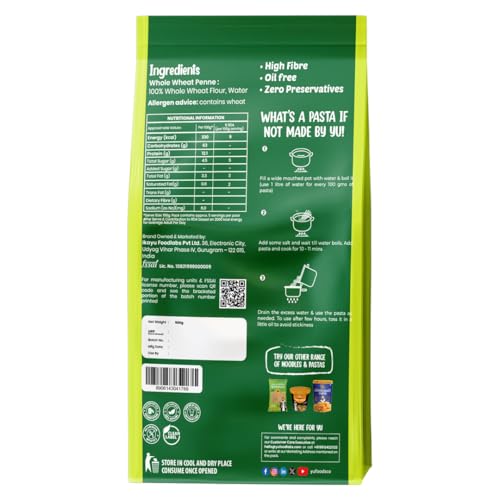 Yu Foodlabs 100% Whole Wheat Pasta – Penne – High Fibre – Zero Preservatives – No Maida & 100% Atta – Just Boil – 500 G – Yu